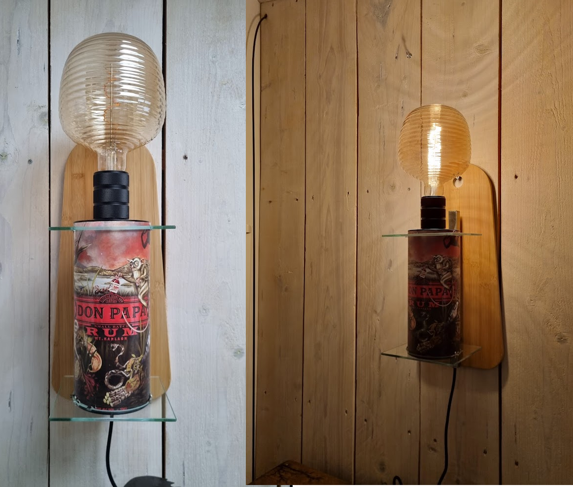 Un boite d'emballage de Rhum rencontre des restes de liminaires de lustre, le tout sur une planche à saucisson.