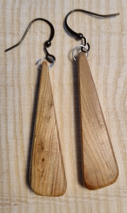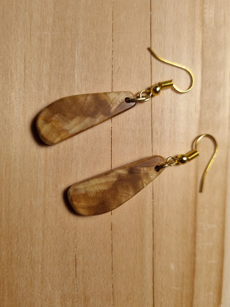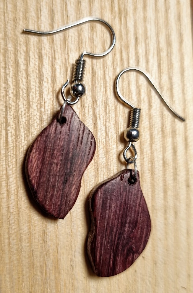 Boucles d'oreilles réalisées dans une chute de bois d'Amarante violet de Madagascar issue d'une vieille lame de plancher.