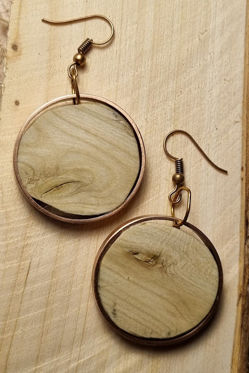 Cette paire de boucles d'oreilles a été créé avec des chutes de bois d'olivier provenant de Lacoste dans le Luberon, agrémentée d'un vieux morceau de tuya de cuivre.