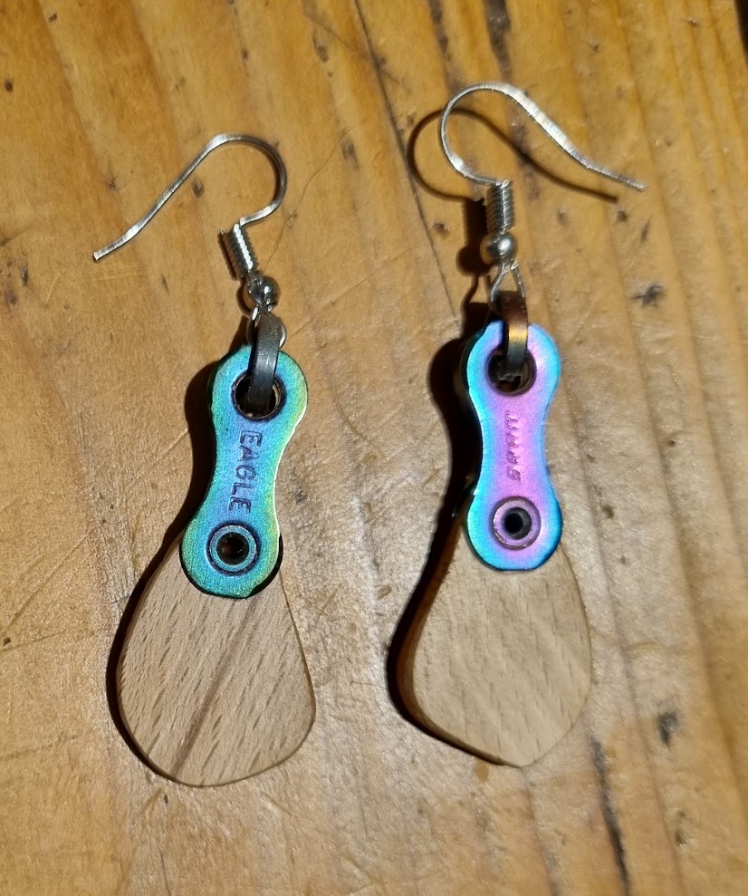 Deux maillons de chaine de vtt finition oil slick servent de support à du hêtre provenant de Chatel-St-Germain.